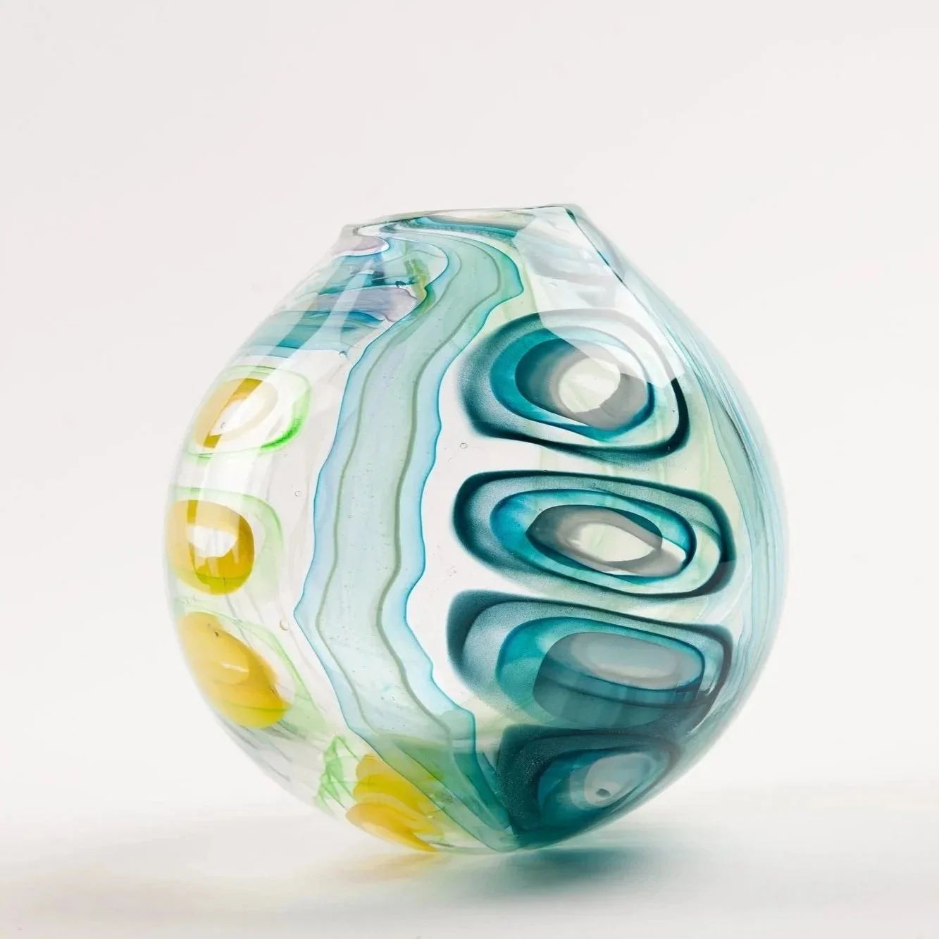 The round ‘murrine’ in my pieces are made by layering colour, stretching it out in a long rope while still molten and then slicing thin sections. These rings of colour (murrine) can be warmed and positioned in the glass blowing process. It’s a long but satisfying process.