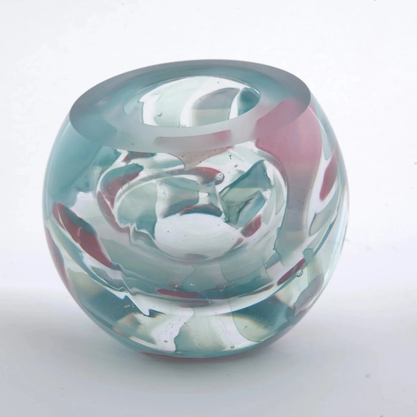 I like to re-use shards of colour and pieces saved from the cullet bucket in my blown glass globes to create a painterly, abstract design. This is a sustainable way of recycling coloured glass discarded in the making process.